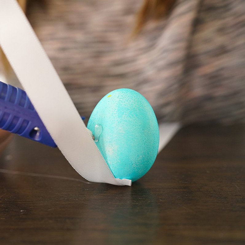 - CUT 12 15” strips of ribbon. WRAP and GLUE a piece of ribbon around each egg. Starting at the smaller end of the egg, GLUE in a straight line down the egg around the larger end and COMPLETE back at the smaller end where you started, allowing 5” of the ribbon at the ends to TIE a bow at the top of the egg. This will become the loop to attach each egg to the tree branch. PLACE ribboned eggs to the side. LET the glue dry.